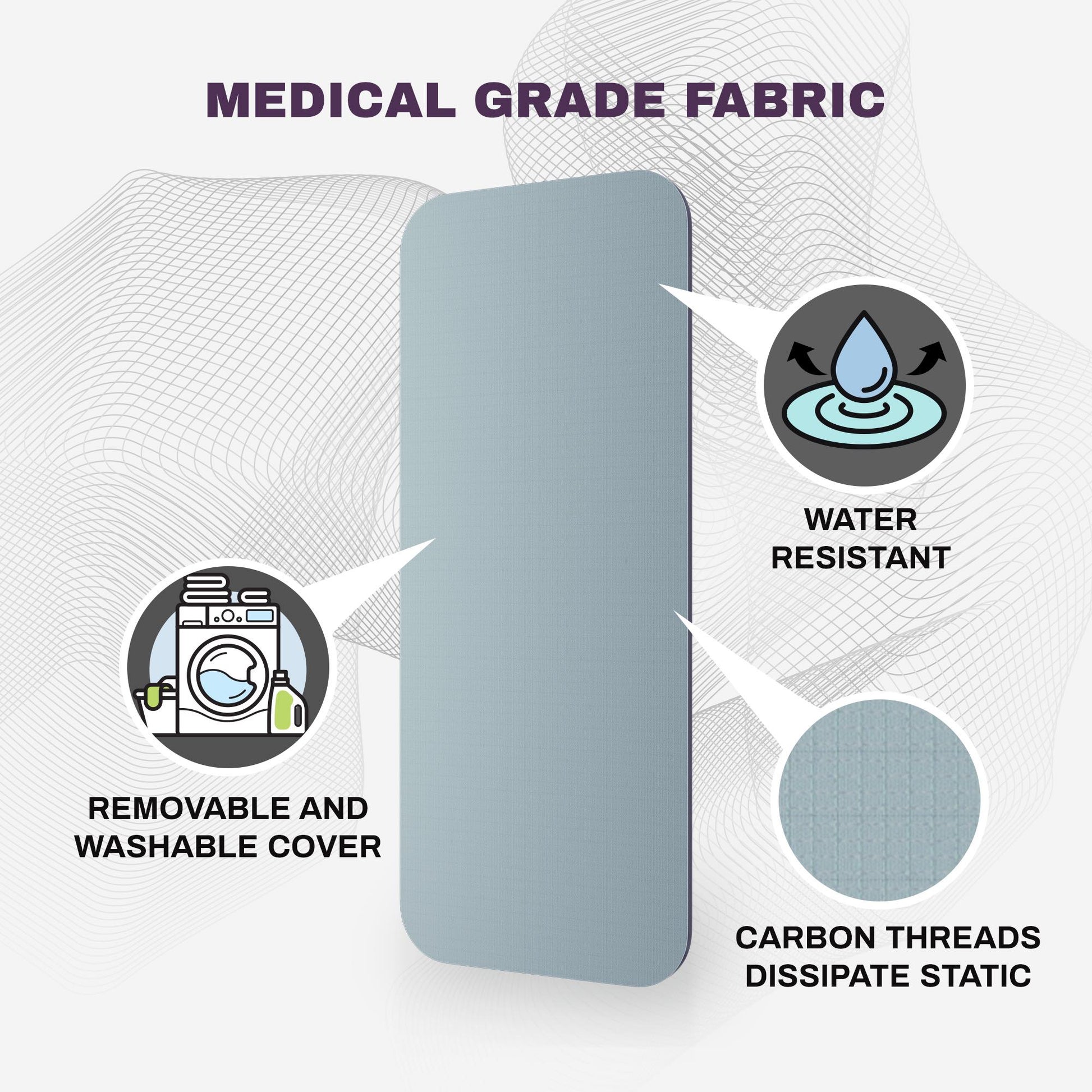 A removable, machine-washable cover made from medical-grade fabric that is water-resistant. The fabric also contains carbon threads to dissipate static.